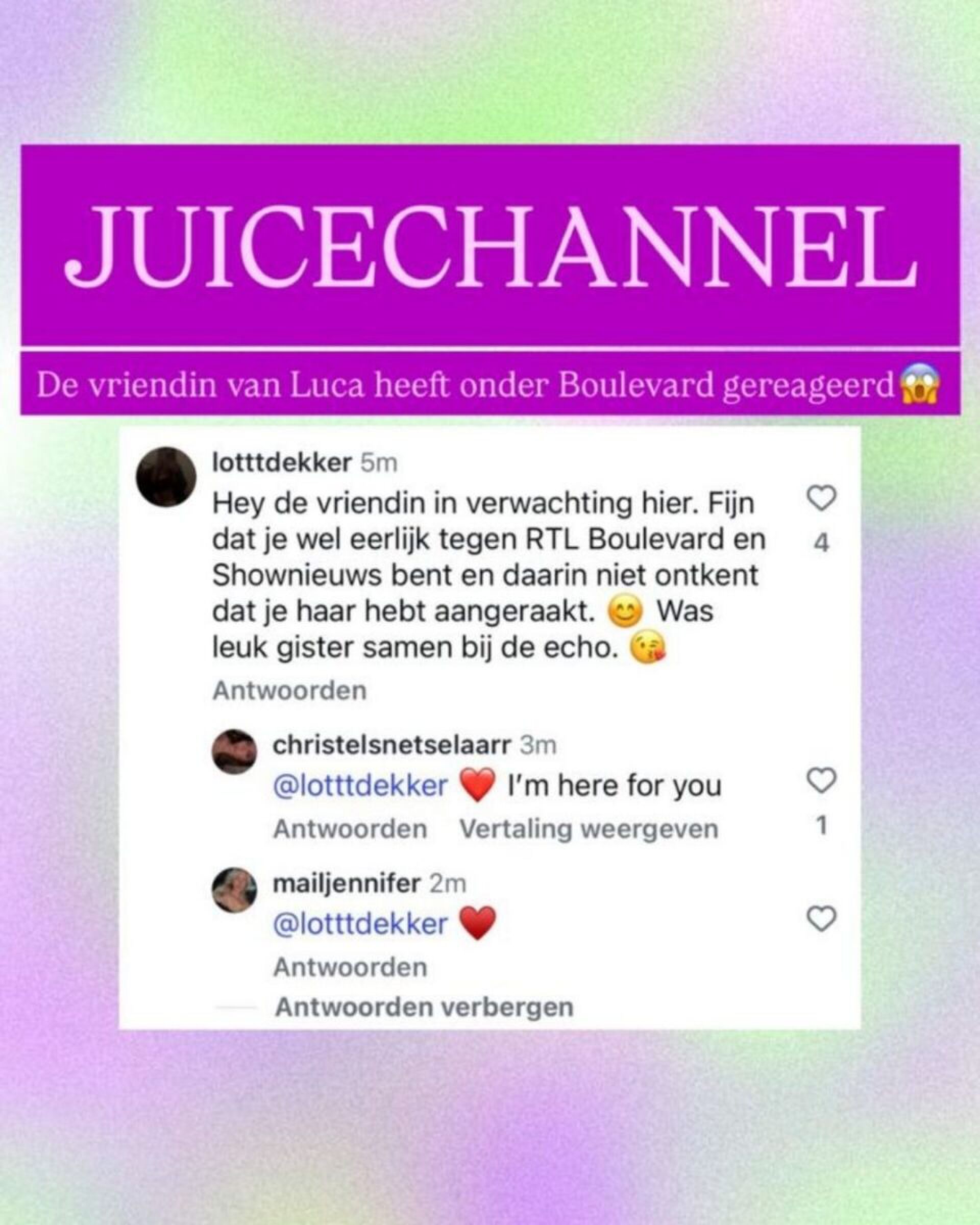 Nu reageert de vriendin van Luca Tor, Lotte, ook op de geruchten. Onder de video’s van Shownieuws reageert zij namelijk met een flinke sneer naar Luca. “Hey de vriendin in verwachting hier. Fijn dat je wel eerlijk tegen RTL Boulevard en Shownieuws bent en daarin niet ontkent dat je haar hebt aangeraakt. Was leuk bij de echo gisteren.” Oei! Dit lijkt te bevestigen dat Luca in ieder geval niet eerlijk is geweest, en de geruchten worden hiermee alleen maar opgezweept…